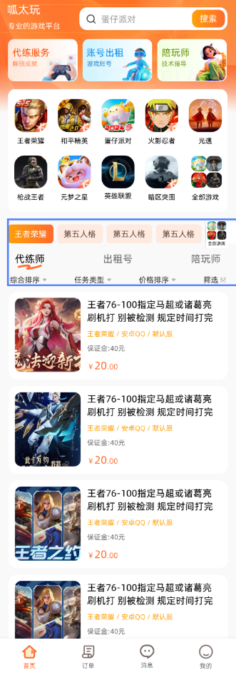陪玩服务:用户可在平台上下单各游戏陪玩大神。